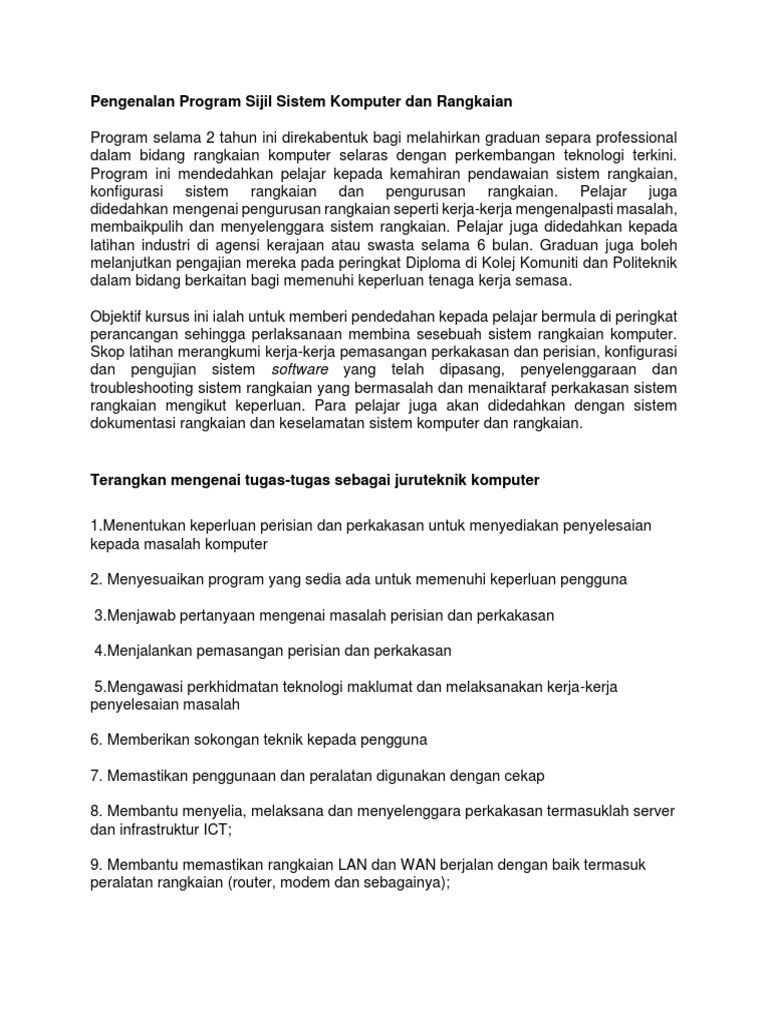 Merupakan pengguna teknologi maklumat yang boleh dipecahkan kepada pengguna yang mengguna dan pengguna yang mentadbir maklumat tersebut. Banyak alasan di balik itu, salah satunya perkembangan teknologi yang sangat pesat, terutama. Sistem komputer terdiri dari alat input, alat pemroses, alat output, dan media penyimpanan. Pengertian sistem bilangan komputer adalah teknik untuk mewakili angka dalam arsitektur sistem. Menghasilkan menghasilkan penyelidik yang berupaya menjalankan penyelidikan dalam bidang rangkaian komputer dan sistem teragih di peringkat pengajian siswazah dan mampu berkhidmat di. Ia digunakan untuk perkongsian maklumat atau operasi perniagaan antara pembekal, pembuat, rakan kongsi, pelanggan atau perniagaan lain pada tahap keselamatan. Dan memproduksi produk yang utama termasuk mikroprosesor, chipset motherboard, embedded prosesor kartu grafis (gpu) dan prosesor untuk server, workstationdan komputer pribadi (pc), dan juga teknologi prosesor untuk perangkat genggam, televisi digital, mobil, konsol game. Bidang latihan kemahiran teknologi komputer (rangkaian) di ilp sandakan menawarkan kursus selama 1 tahun 6 bulan. Rangkaian komputer adalah sekumpulan peranti, dikenali juga sebagai nod, yang berhubungan dengan media penghubung. Sehingga membentuk suatu sistem kerja. Sesetengah penggodam komputer menceroboh sistem rangkaian komputer untuk meniru atau mencuri data. Binaan komputer perkakasan dan perisian asas rangkaian asas teknologi komputer dan 1.2.1 perisian sistem perisian sistem bertujuan untuk menghidupkan komputer dan ia terletak di windows adalah sistem pengoperasian komputer peribadi yang paling popular dan dibangunkan. Komunikasi dan rangkaian, internet, fail dan pangkalan data, sistem maklumat serta pengaturcaraan dan bahasa pengaturcaraan.